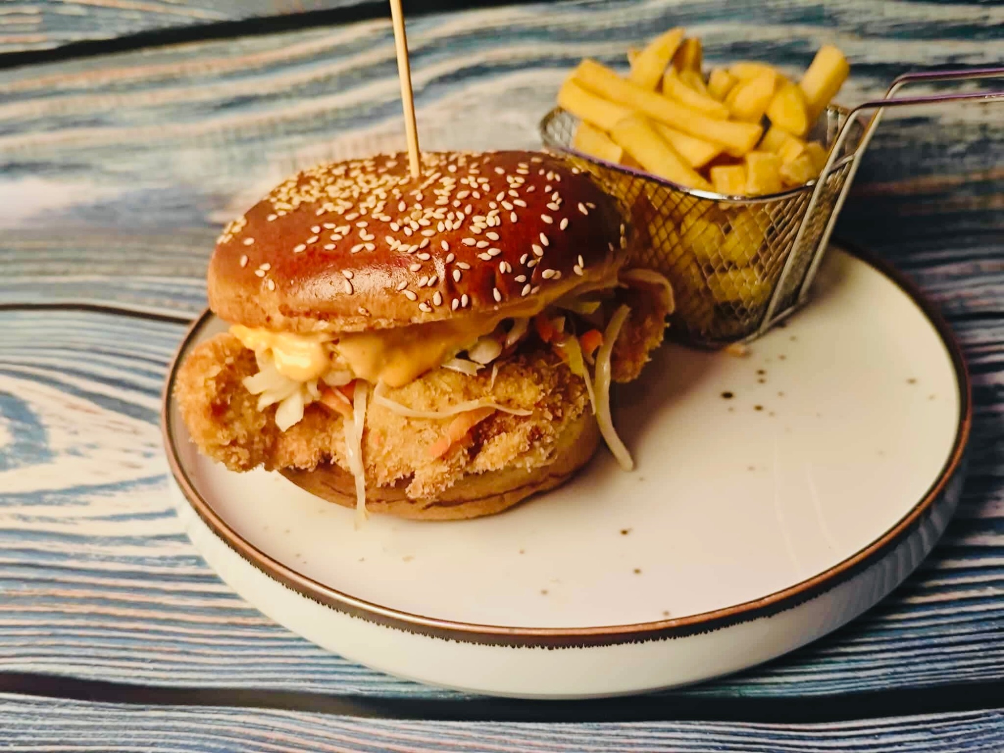 CHRUPIĄCE STRIPSY W SEKRETNEJ PANIERCE Z PARMEZANEM PODAWANE Z FRYTKAMI, SAŁAKĄ COLESALW, SOSEM MIDOOWO MUSZTARDOWYM, SOSEM RANCH